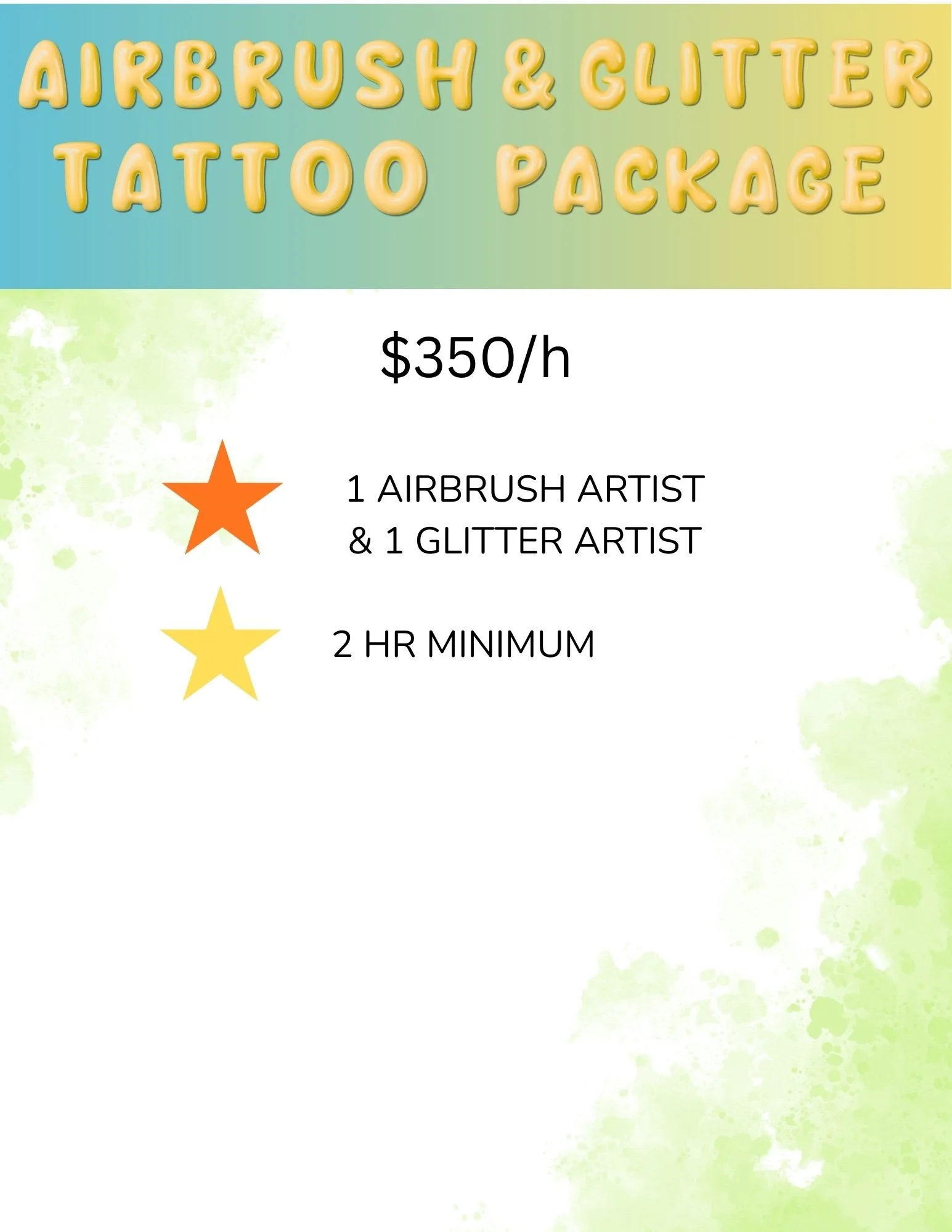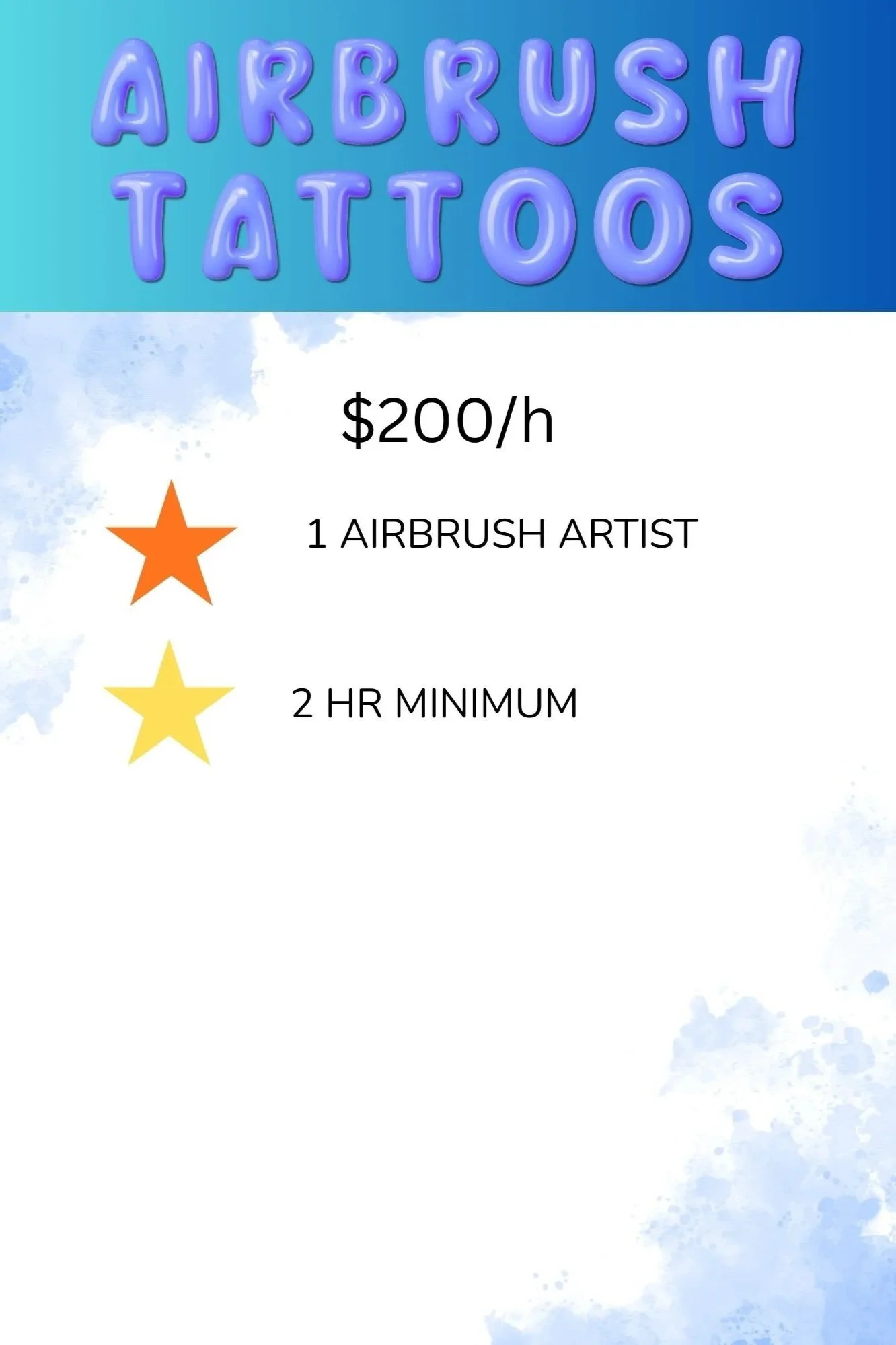 Our Artists use only FDA compliant, cosmetic grade makeup that can last 3-5 days when cared for, but removable immediately with oil or alcohol! Airbrush tattoos are a hit for any party. They're also a perfect match for swim parties and any event with water activities, lasting longer than traditional face paint. From the simple to the sublime, your guests will rave about their designs!